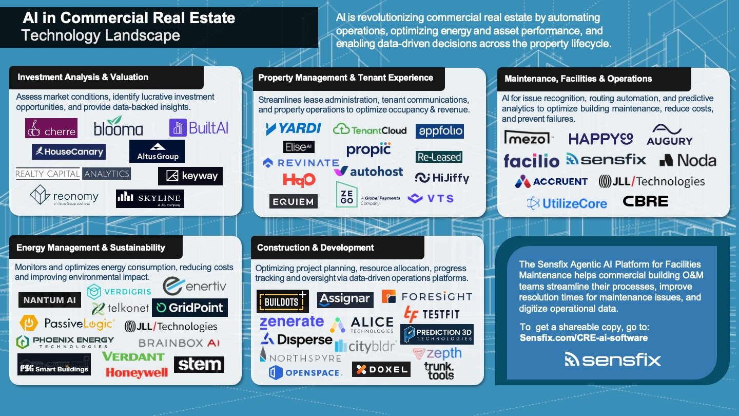 Companies like Facilio offer unified software platforms that they say leverage AI-led predictive engines to help real estate portfolios digitize processes and optimize their property operations. The Sensfix Agentic AI Platform is designed to help commercial building operations and maintenance teams streamline their issue identification and resolution processes, improving time to resolution and allowing them to digitize various types of previously analog data. ServiceChannel promotes AI-enabled tech designed to monitor and more efficiently manage building systems in real time.
